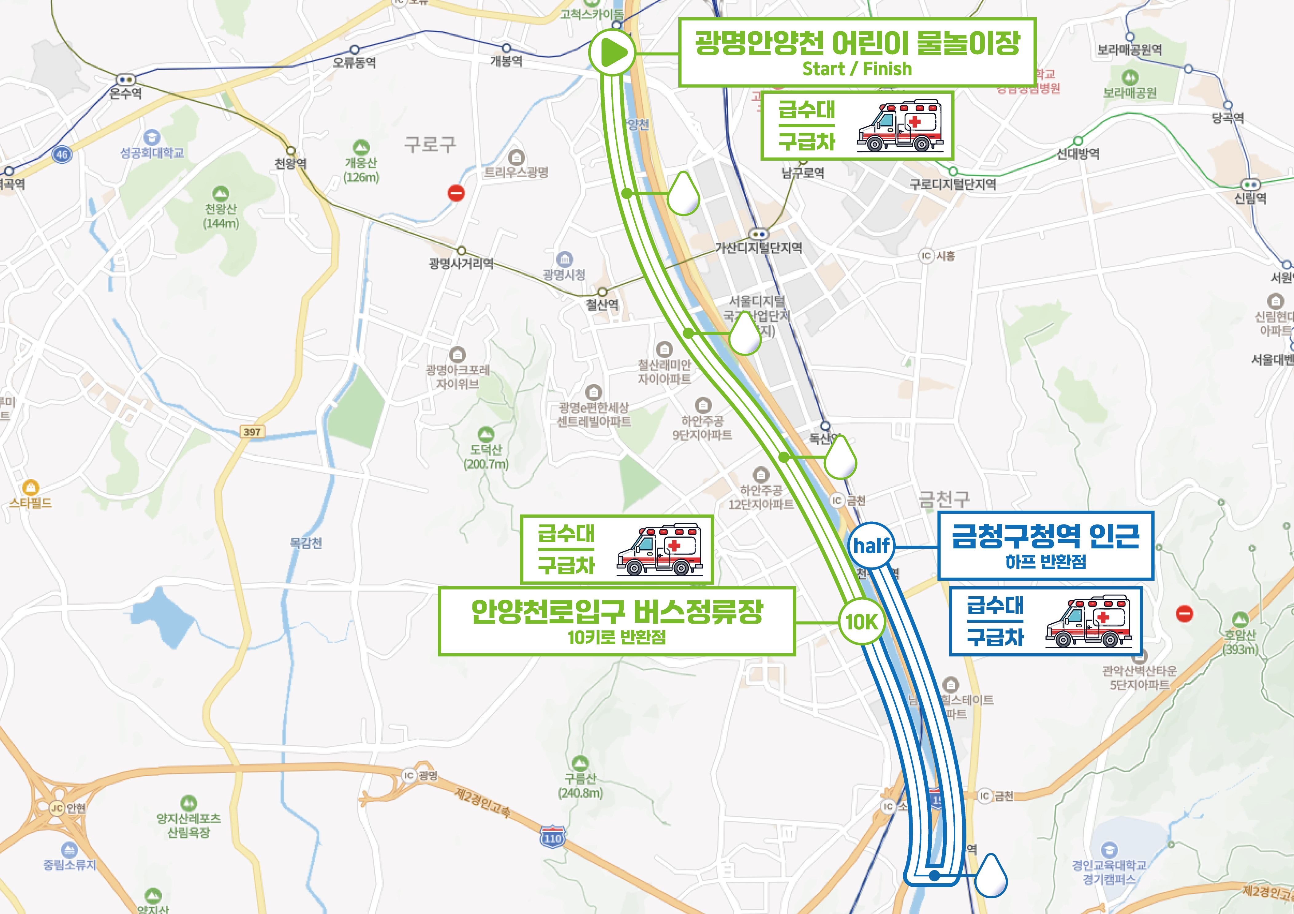 광명 안양천 어린이 물놀이장에서 "출발/도착" 하는 것은 변동없으나, 마라톤 주로 코스는 변경될 수 있습니다.
