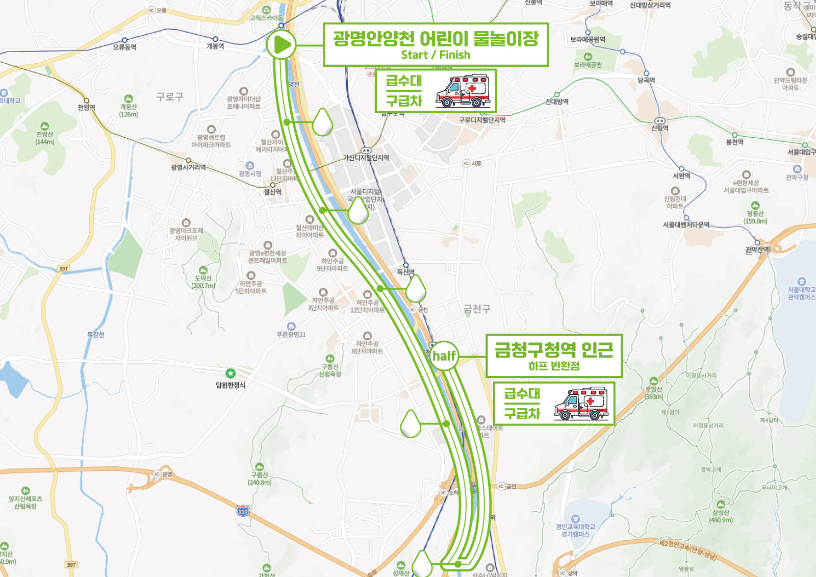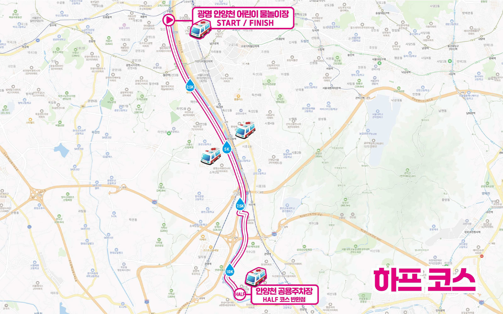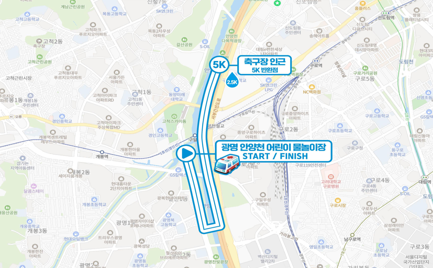 광명 안양천 어린이 물놀이장에서 "출발/도착" 하는 것은 변동없으나, 마라톤 주로 코스는 변경될 수 있습니다.